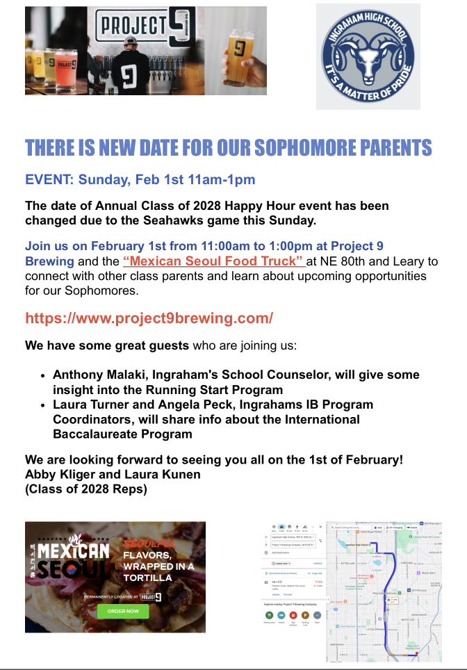 Join us next Thursday, February 5th from 6-8 pm at Halcyon in Greenwood to connect with other caregivers, learn more about Ingraham High School and enjoy a drink and a bite. We will gather in the room to the right of the front door.